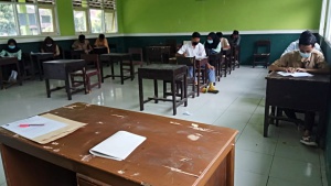 Pelaksanaan Ujian setiap paginya, diawali dengan persiapan peserta didik di luar kelas, yaitu pengukuran suhu badan semua peserta didik di pintu gerbang dengan alat THERMOGUN, selanjutnya mencuci tangan dengan sabun pada tempat yang telah disediakan serta berbaris di halaman dengan jarak 1 meter, dan dilanjutkan dengan kegiatan Do’a Bersama dan Muroja’ah Tahfidz.